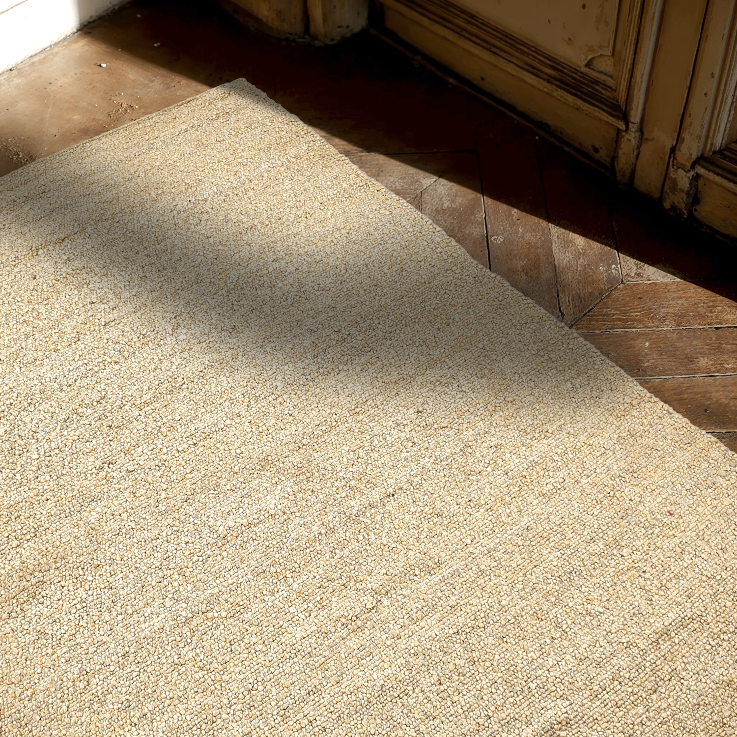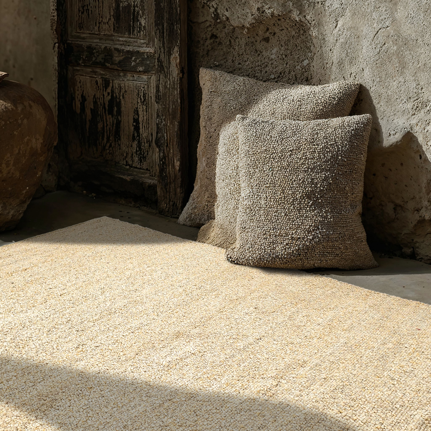 Der Teppich ist wasserbeständig, sollte jedoch bei Regen aufgehängt werden, damit sich kein Wasser darunter sammelt – so werden sowohl der Teppich als auch der Untergrund geschützt und seine Lebensdauer sowie Formstabilität erhalten.