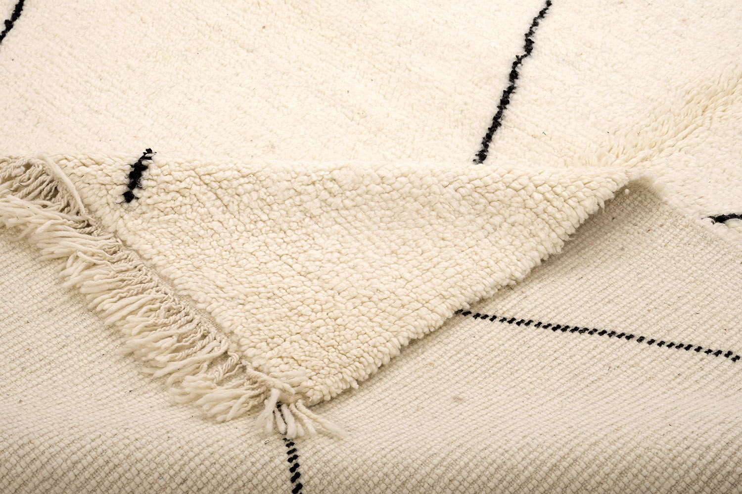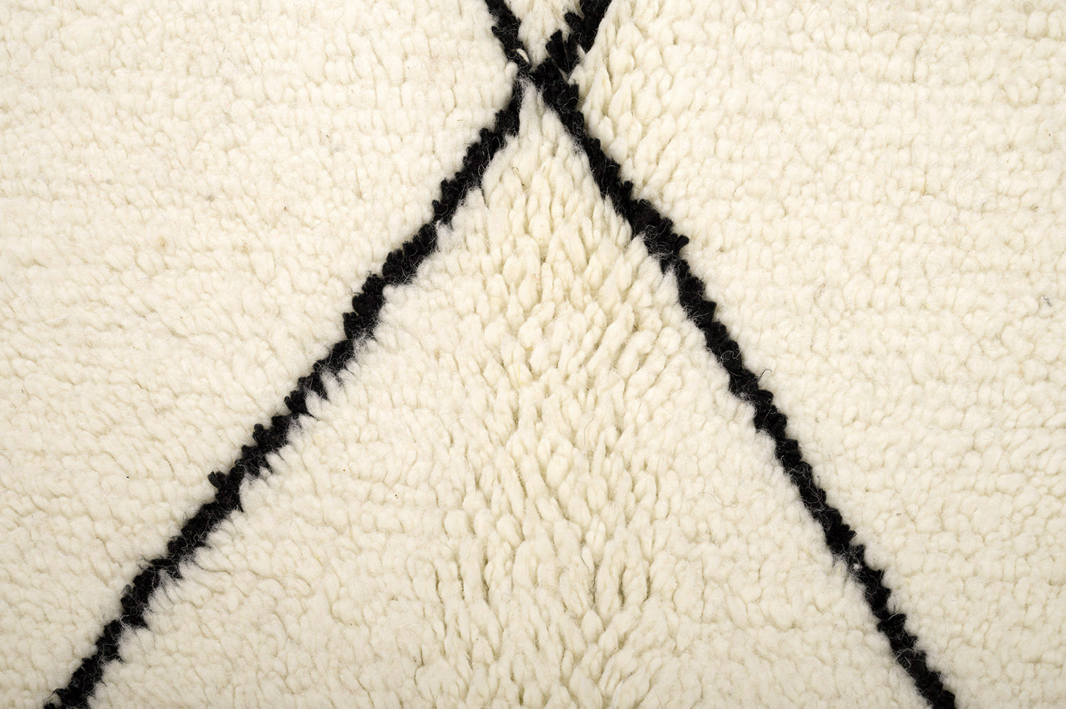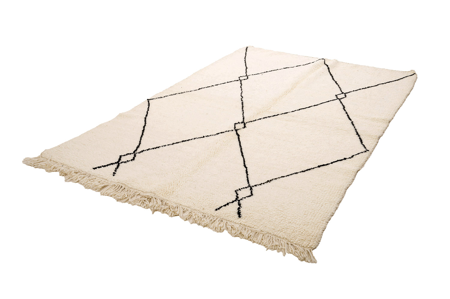 Die Wolle der Schafe im Atlasgebirge ist einfach unvergleichlich. Ein Beni Ourain-Teppich wird nur aus dieser Wolle und ihren natürlichen Farben hergestellt. Ein echter Beni Ourain-Teppich wird mit einfachen, raffinierten Mustern gewebt. Er ist bei Designern und Verbrauchern auf der ganzen Welt sehr gefragt. Ein echter Beni Ourain ist ein Kunstwerk für den Boden. Bei richtiger Pflege behält der Teppich seine schönen Farben und die Wolle nutzt sich nicht ab. Ein Teppich, der von Generation zu Generation weitergegeben wird.